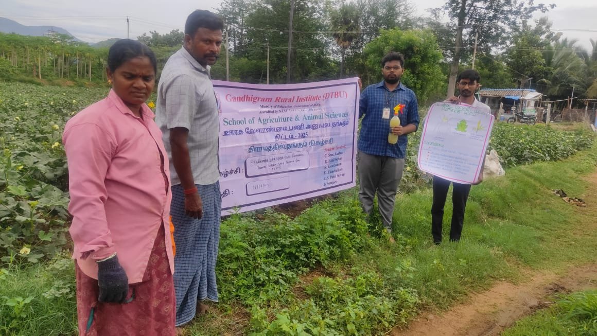 திண்டுக்கல் காந்திகிராம பல்கலைக்கழக வேளாண் இறுதி ஆண்டு மாணவர்கள் கௌதமன், போற்றி செல்வன், இளஞ்செழியன், சஞ்சீவ், எழில் செல்வன், ஸ்ரீ அக்க்ஷன் ஆகியோர் அலங்காநல்லூர் மணி வெண்டை நிலத்தில் மஞ்சள் நரம்பு மொசைக் நோய் பாதிப்பு அடைநீத பயிருக்கு உதவி வேளாண்மை அலுவலர் இந்திரஜித் அவர்களுடன் இணைந்து நோய் தடுப்பு மற்றும் செயல்விளக்கம் வழங்கினர்.
