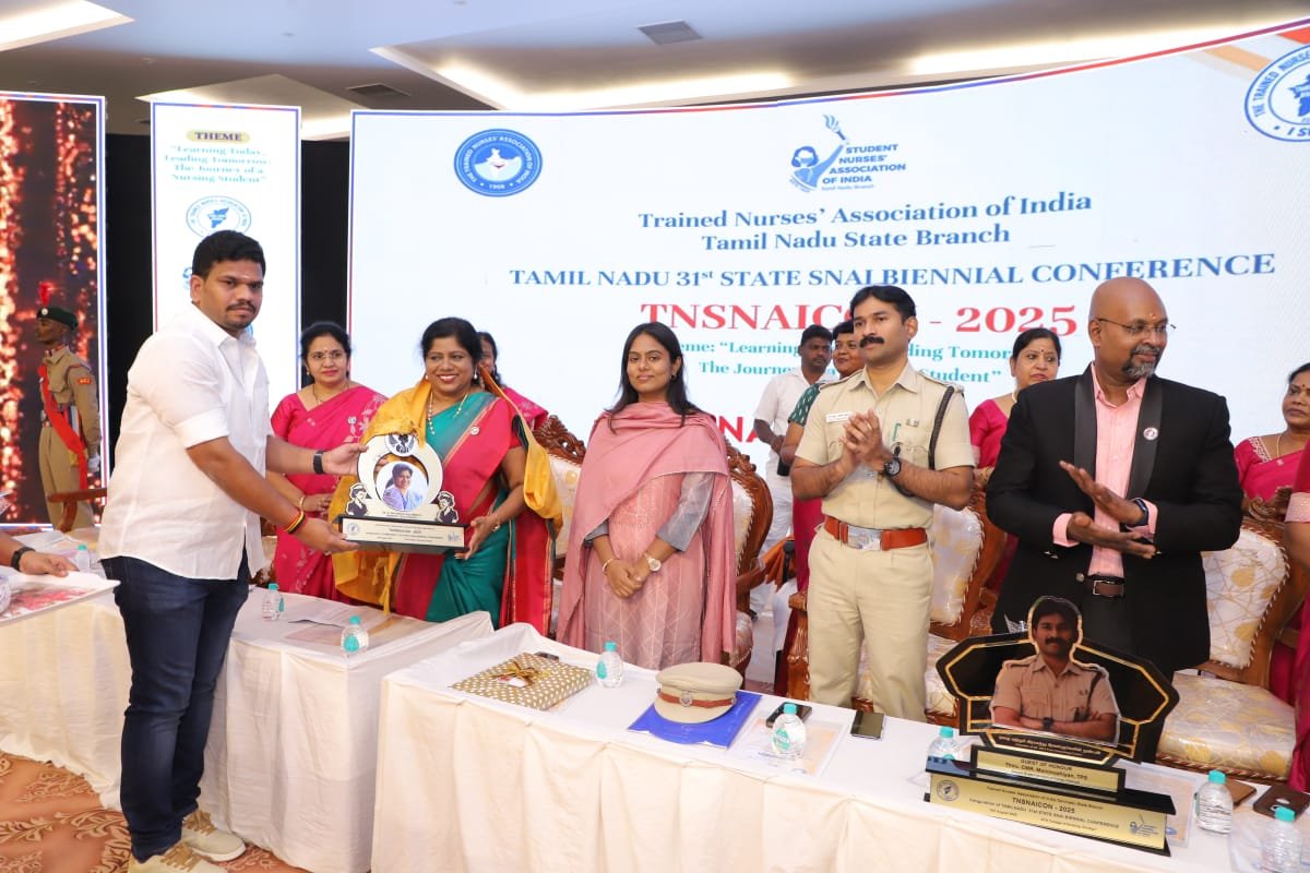 ஜி டி என் செவிலியர் கல்லூரியில் நடைபெற்ற தமிழ் மாநில செவிலிய மாணவர்கள் சங்கத்தின் 31 வது மாநில மாநாட்டில் தமிழ் மாநில பயிற்சி பெற்ற செவிலியர் சங்கத் தலைவர் ஆனி கிரேஸ் கலைமதி திண்டுக்கல் ஜி டி என் கல்விக் குழும இயக்குனர் துரை ரத்தினம் சால்வை அணிவித்து நினைவு பரிசு வழங்கினார். அருகில் திண்டுக்கல் மாவட்ட உதவி ஆட்சியர் வினோதினி, சென்னை காவல் துணை கண்காணிப்பாளர் மணிமொழியன்,தமிழ் மாநில பயிற்சி பெற்ற செவிலியர் சங்கத்துணைத் தலைவர் உதயகுமார் ஆகியோர் உள்ளனர்.