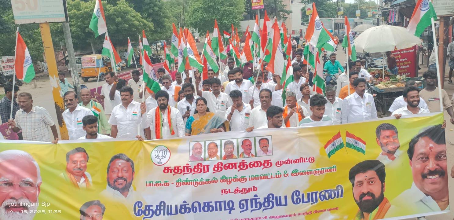 பாஜக திண்டுக்கல் கிழக்கு மாவட்ட தலைவர் முத்துராமலிங்கம் தலைமையில் மாவட்ட இளைஞர் அணி தலைவர் அன்பு ஹரிஹரன் முன்னிலையில் பாஜகவினர் பேருந்து நிலையத்திலிருந்து மாநகராட்சி காந்தி சிலை வரை தேசிய கொடியை ஏந்தி பேரணியாக சென்றனர்.